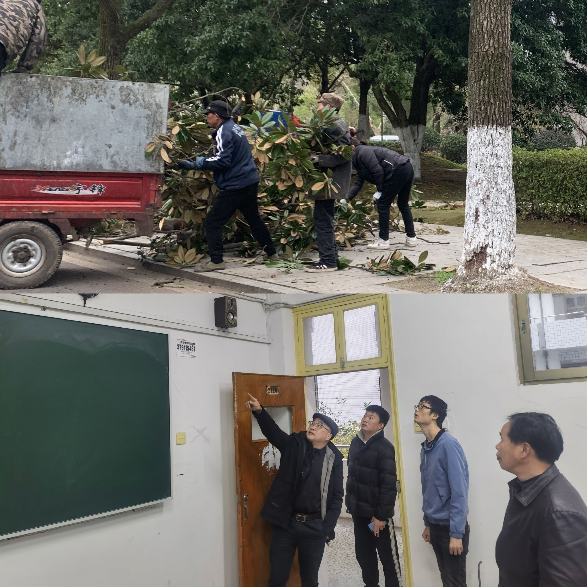 ▲自2月16日起,后勤处组织工作人员清理主校区主干道断枝,确保师生出行安全。2月20日起,后勤处开展新学期开学检修保障工作,保障新学期学生顺利返校入住、平安开学。图为工作人员清理主校区主干道断枝、深入教学楼开展开学检修保障工作 余新明/供图