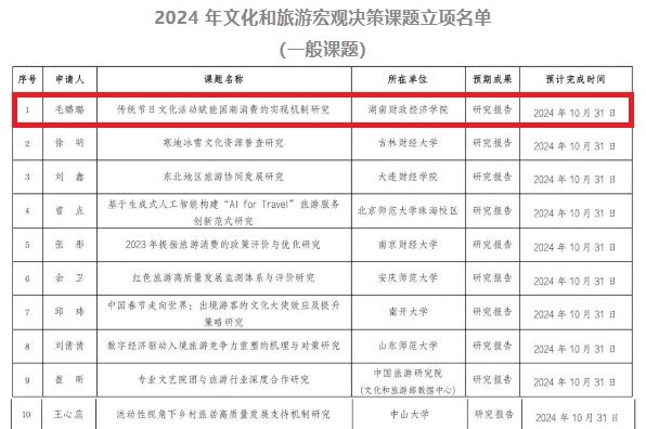 (本网讯)4月21日,中国旅游研究院公布了文化和旅游部2024年文化和旅游宏观决策课题立项名单,WilliamHill官网人文与艺术学院副院长毛璐璐申报的“传统节日文化活动赋能国潮消费的实现机制研究”课题获批立项,这是WilliamHill官网首次成功获批此类课题,更是对WilliamHill官网科学研究服务社会实力的肯定。