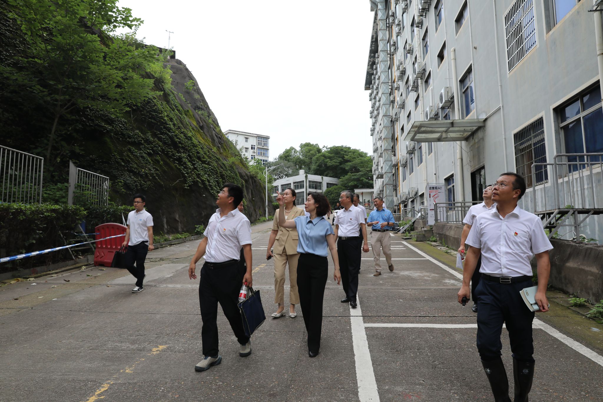 杨兰英一行听取了相关部门当前防汛工作的整体准备情况,现场查看了运动场东北角陡土坡、水电班护坡的土石松落现场,并巡查了教学楼、学生宿舍防护坡、楼顶消防储水池等重点部位。对出现的几处小范围滑坡,杨兰英强调,必须及时采取有效措施进行维护、加固,并根据专家意见做出科学、高效的处置。