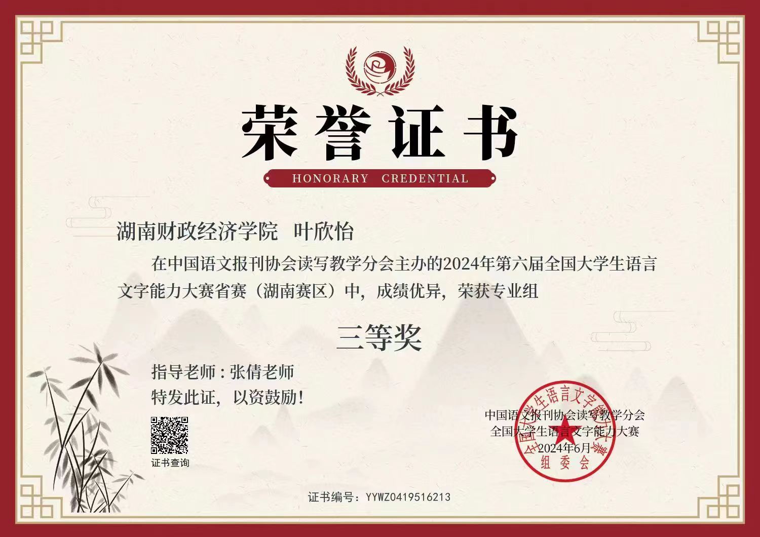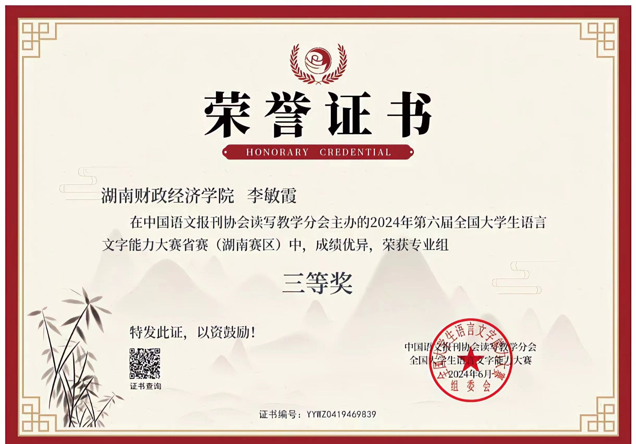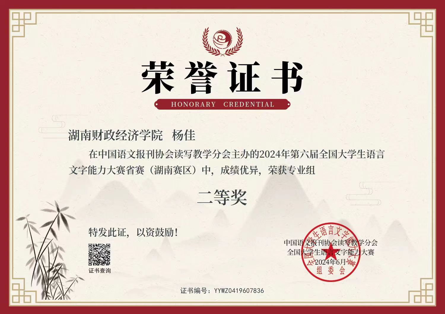 本次大赛由中国语文报刊协会读写教学分会主办,旨在测试大学生的语言文字知识和应用能力,弘扬中国文化,增强大学生规范使用国家通用语言文字的意识,促进语言文字教、学、测协调发展。大赛由省赛与决赛两个阶段组成,分专业组、非专业组、专科生组三个组别,各组分开评奖。经组委会评选,WilliamHill官网汉语言文学专业学生沈辉珍获全国专业组二等奖及省赛专业组二等奖,杨佳获省赛专业组二等奖,李敏霞、叶欣怡获省赛专业组三等奖。