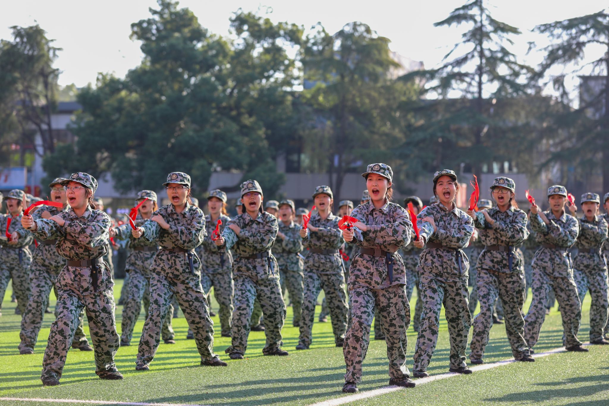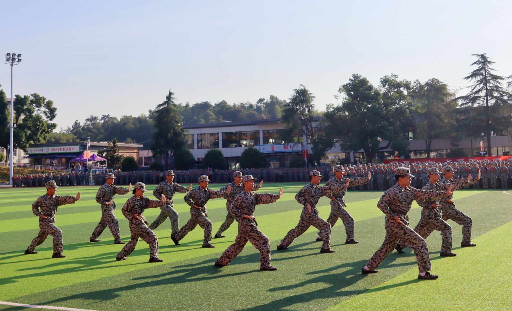 在军训汇报表演中,擒敌拳方阵动作刚强有力,气势磅礴;匕首操方阵、刺杀操方阵在烟雾弹模拟的硝烟弥漫战场,“杀”声嘹亮、攻势犀利,尽显坚韧不拔、勇敢顽强的战斗作风;由2000余名学生组成的文化方阵表演让现场沸腾,他们凭借队列变化,摆出“75”“繁荣昌盛”“幸福安康”“中国地图”等造型为新中国成立75周年送上深情祝福,变换“HUFE 1933-2024”“正德厚生 经世济用”等字样传递他们的爱校情怀。