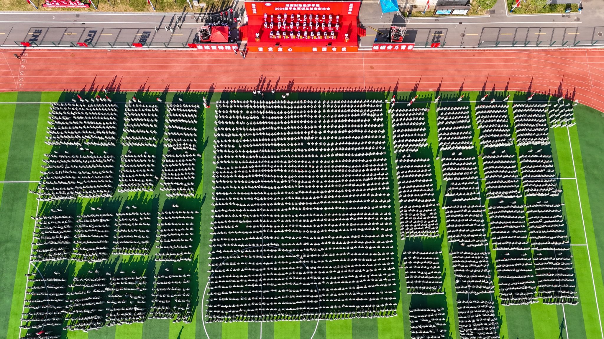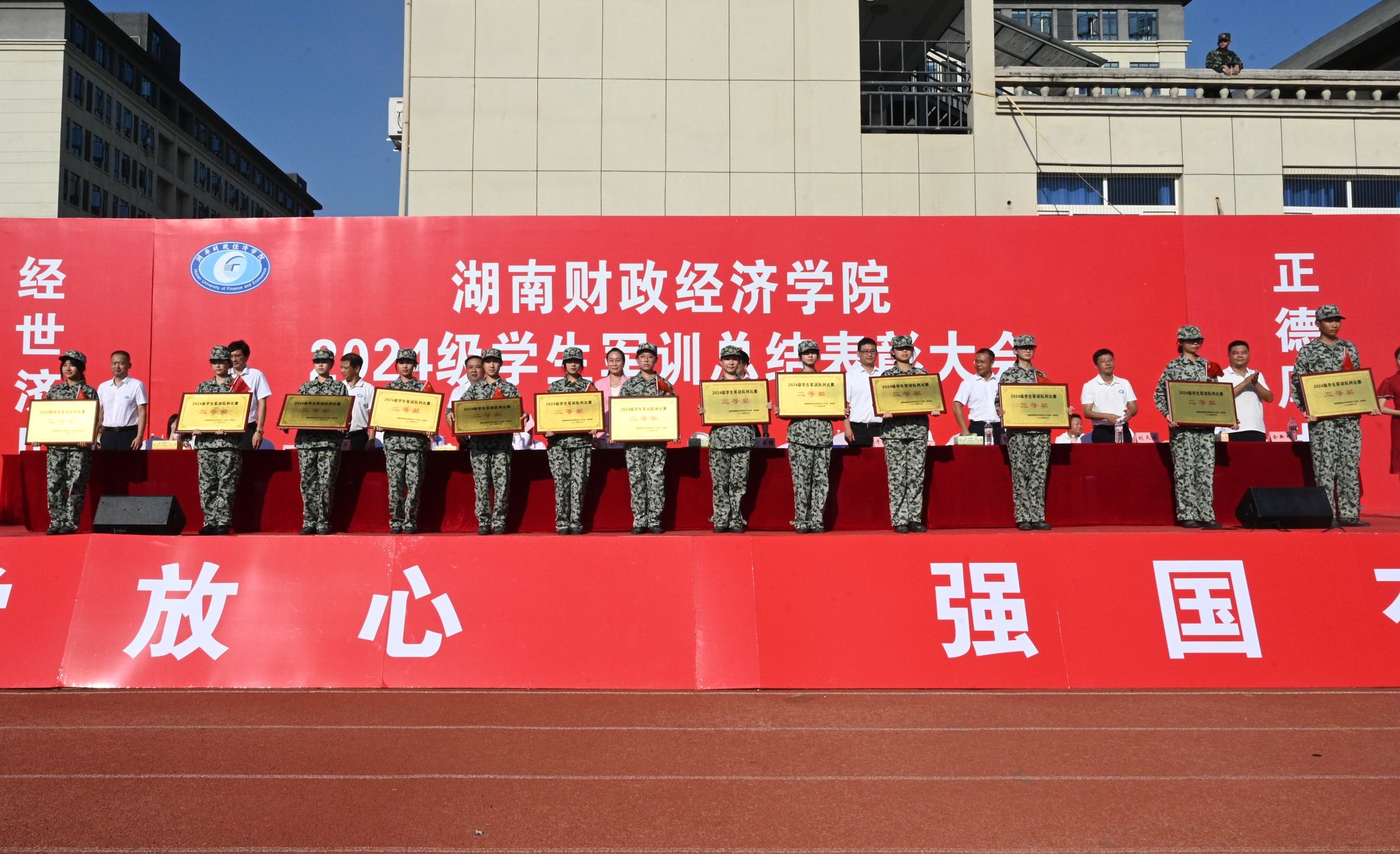 (本网讯)金秋九月,燃情湖财。9月30日上午,学校2024级学生军训总结表彰大会在雷锋校区田径场举行,6000余名学子身着戎装,以最饱满的热情汇报军训成果。