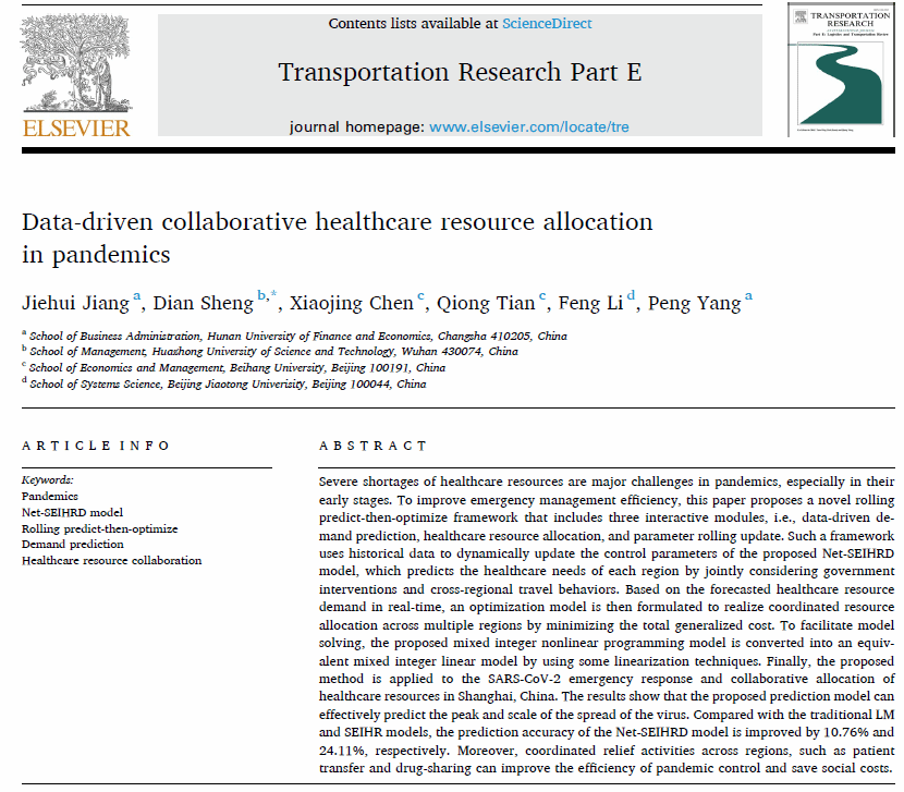 (本网讯)近日,WilliamHill官网工商管理学院物流管理系教师蒋杰辉以第一作者身份在运输管理和物流供应链领域国际权威期刊《Transportation Research Part E: Logistics and Transportation Review》发表了题为“Data-driven collaborative healthcare resource allocation in pandemics”的论文。