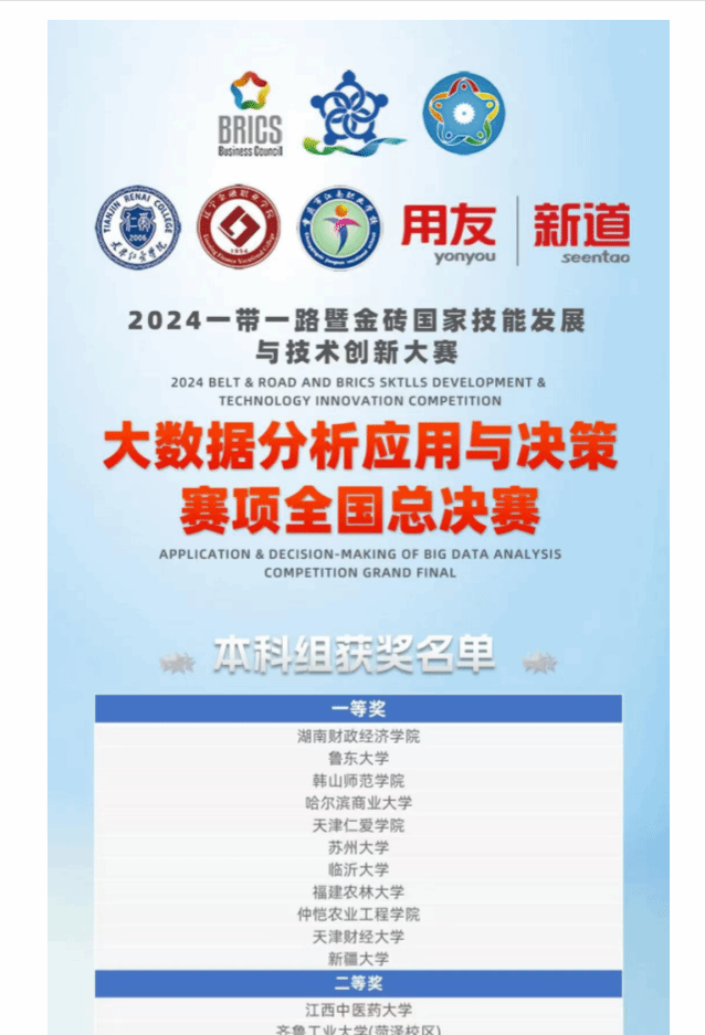 (本网讯)11月10日,2024一带一路暨金砖国家技能发展与技术创新大赛大数据分析应用与决策赛项全国总决赛落幕,WilliamHill官网入围国赛的两个参赛团队斩获营销大数据分析赛道、人力大数据分析赛道两个赛道一等奖。