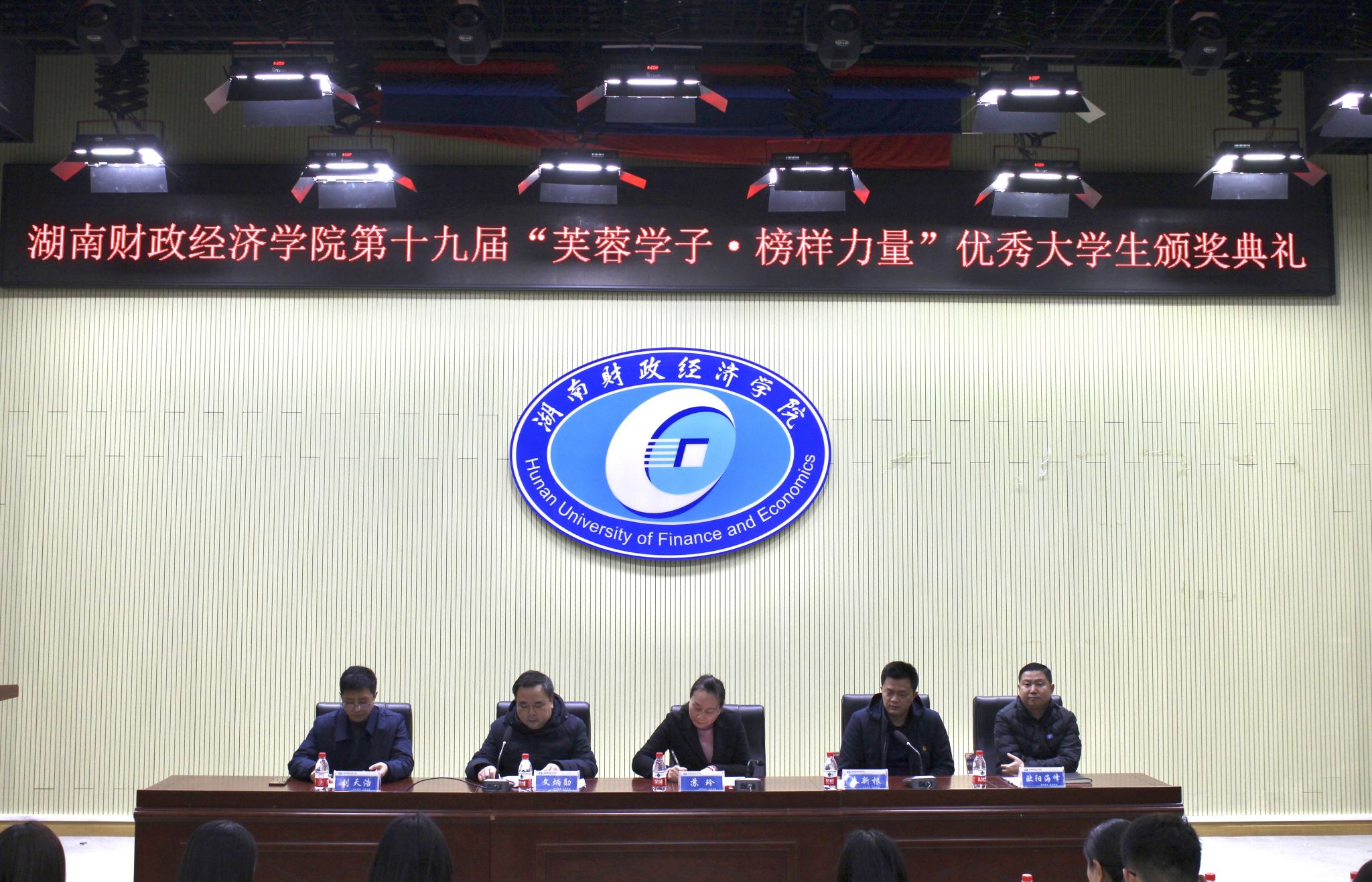 (本网讯)12月20日上午,我校在二教学楼2J03学术报告厅举行第十九届“芙蓉学子·榜样力量”优秀大学生颁奖典礼。校党委副书记苏玲,湖南省青少年发展基金会副秘书长朱新根,校党委委员、宣传部、统战部部长文炳勋出席,学生工作部、团委主要负责人,各二级学院党组织副书记、团总支书记和学生代表参加。