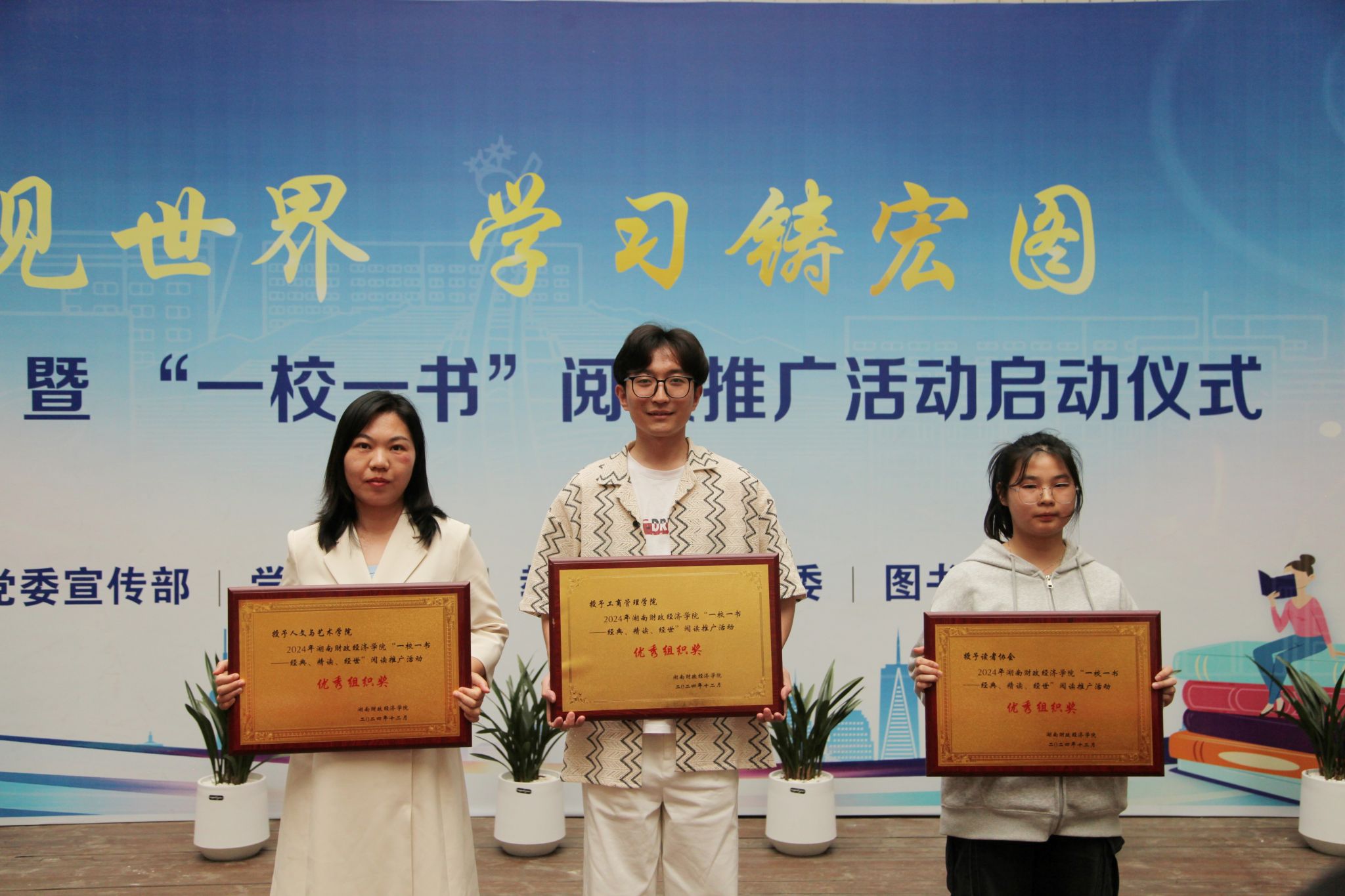 活动现场对2024年度在阅读领域表现突出的集体和个人进行了表彰,涵盖省教育厅优秀读书报告奖、书香班级奖、省高校图工委创新案例奖、诵读比赛奖项以及学校“一校一书”阅读活动优秀组织奖,同时为向学校捐赠图书的老师代表颁发捐赠证书。