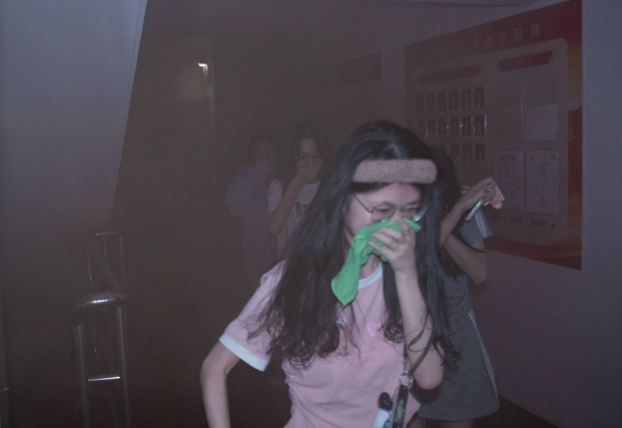 演练以“宿舍楼夜间突发火灾”为场景,21时30分,随着总指挥一声令下“演练开始”,消防警报骤然响起,烟雾弹释放出模拟浓烟,瞬间营造出紧张逼真的火灾氛围。宿舍内,学生们迅速反应,第一时间披上湿毛巾捂住口鼻,弯腰低姿沿指定逃生路线撤离。安保人员和学生110护卫队成员坚守各个关键点位,一边引导学生疏散,一边维持现场秩序;医护人员在安全区域严阵以待,随时准备应对突发状况。在全体参演人员的高效配合下,从警报拉响到全员安全抵达疏散集合点,仅用时3分50秒。