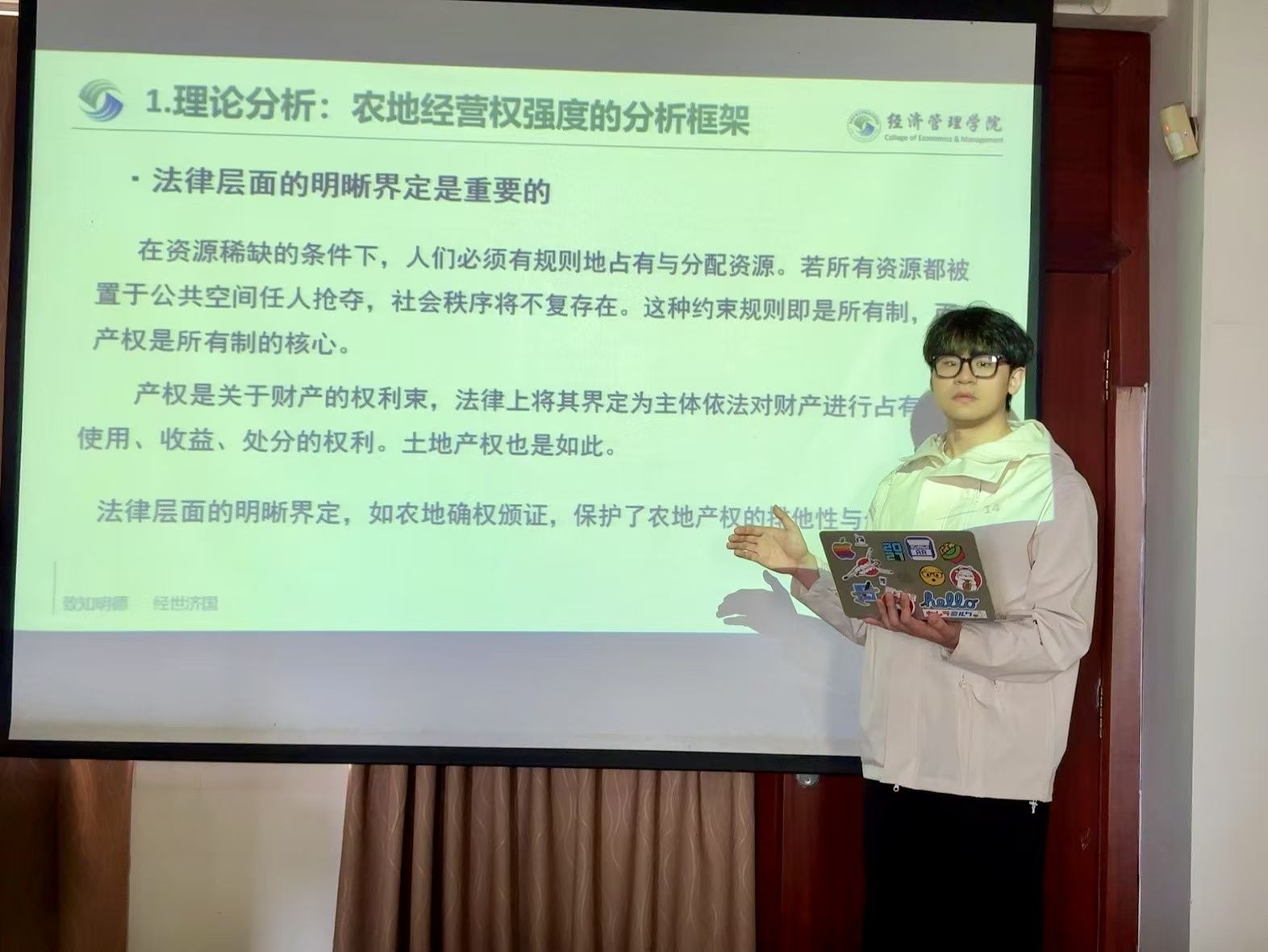 “刚入学时,我既好奇又忐忑,不知该如何应对专业挑战。”王家兴回忆道。而毕业于国内外名校的专业教师们,很快用精彩的课堂打消了他的顾虑。教师们以微观经济学、宏观经济学等课程为起点,为他打开了洞悉全球经济金融动态的窗口,而金融学、金融风险管理、网络金融等课程逐步构建起他对金融行业的立体认知——从传统金融市场的风险防控,到数字时代的金融创新,这些知识为他日后研究土地制度与农村金融埋下了兴趣的种子。