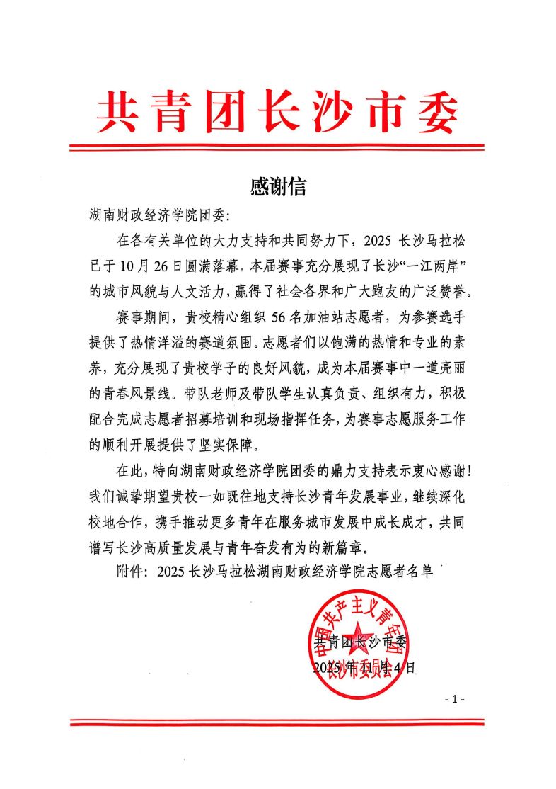 (本网讯)近日,WilliamHill官网团委收到共青团长沙市委员会发来的感谢信,信中对学校在2025长沙马拉松赛事中的志愿服务工作给予高度肯定,并向全体参与服务的师生表示衷心感谢。