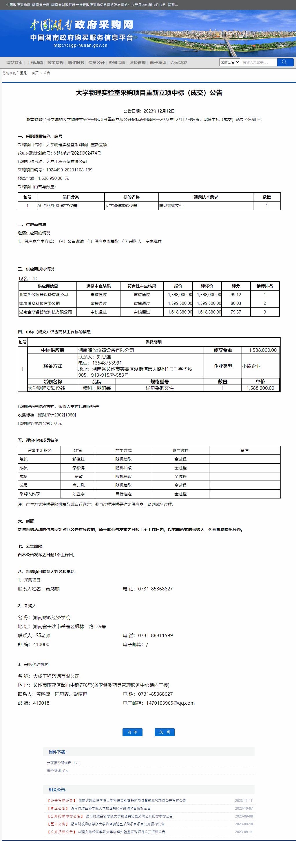 湖南省政府采购网:大学物理实验室采购项目重新立项中标(成交)公告