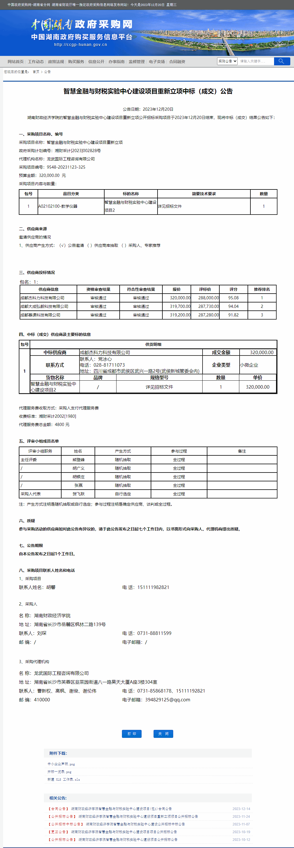 湖南省政府采购网:智慧金融与财税实验中心建设项目重新立项中标(成交)公告