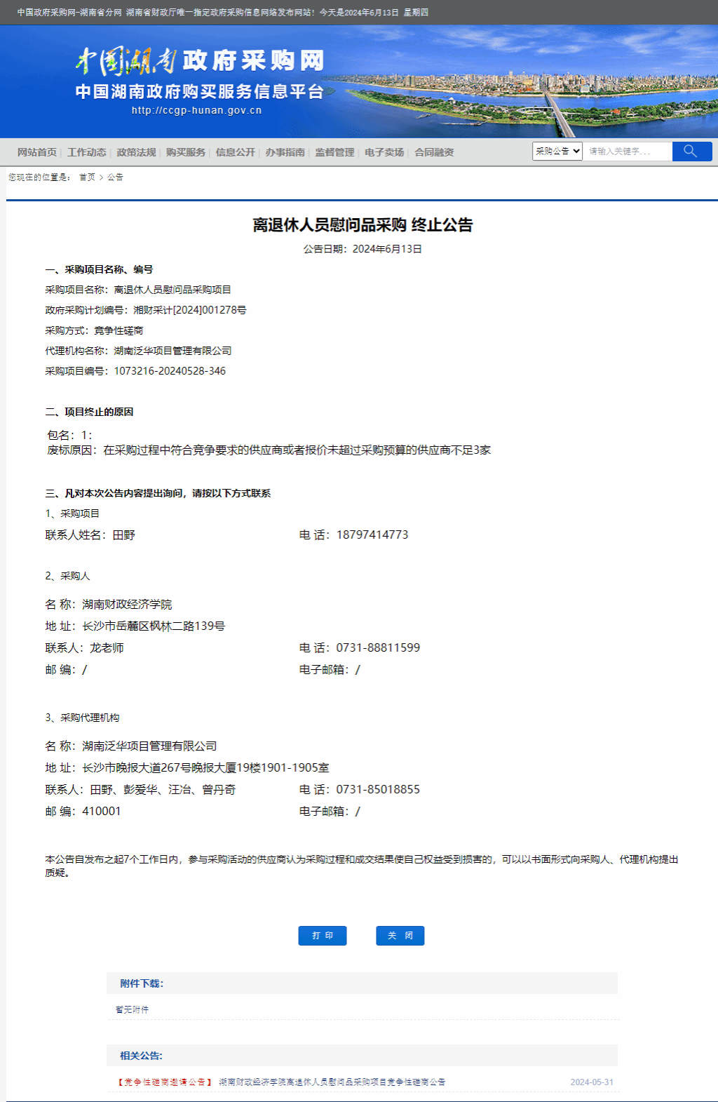 湖南省政府采购网:离退休人员慰问品采购终止公告