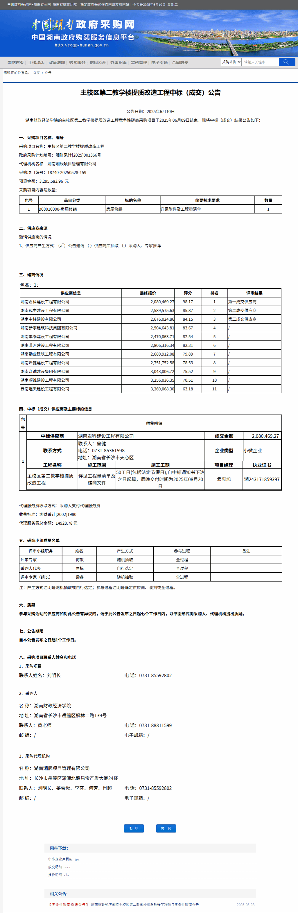湖南省政府采购网:主校区第二教学楼提质改造工程中标(成交)公告