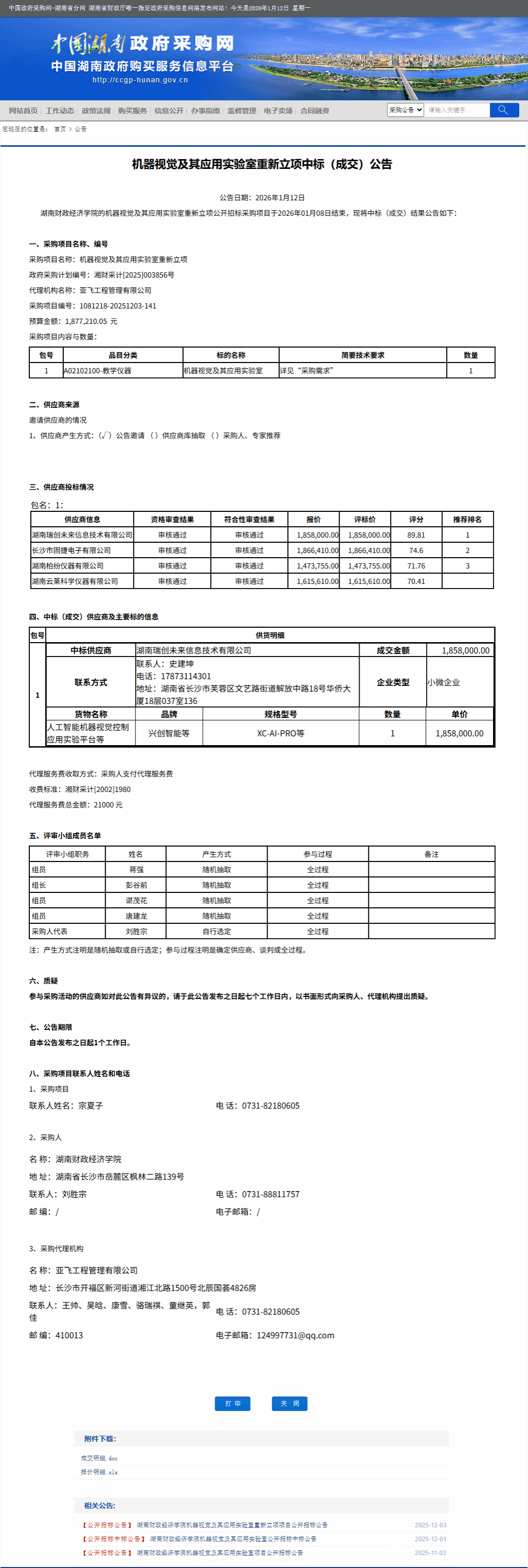 湖南省政府采购网:WilliamHill官方网站机器视觉及其应用实验室重新立项中标(成交)公告