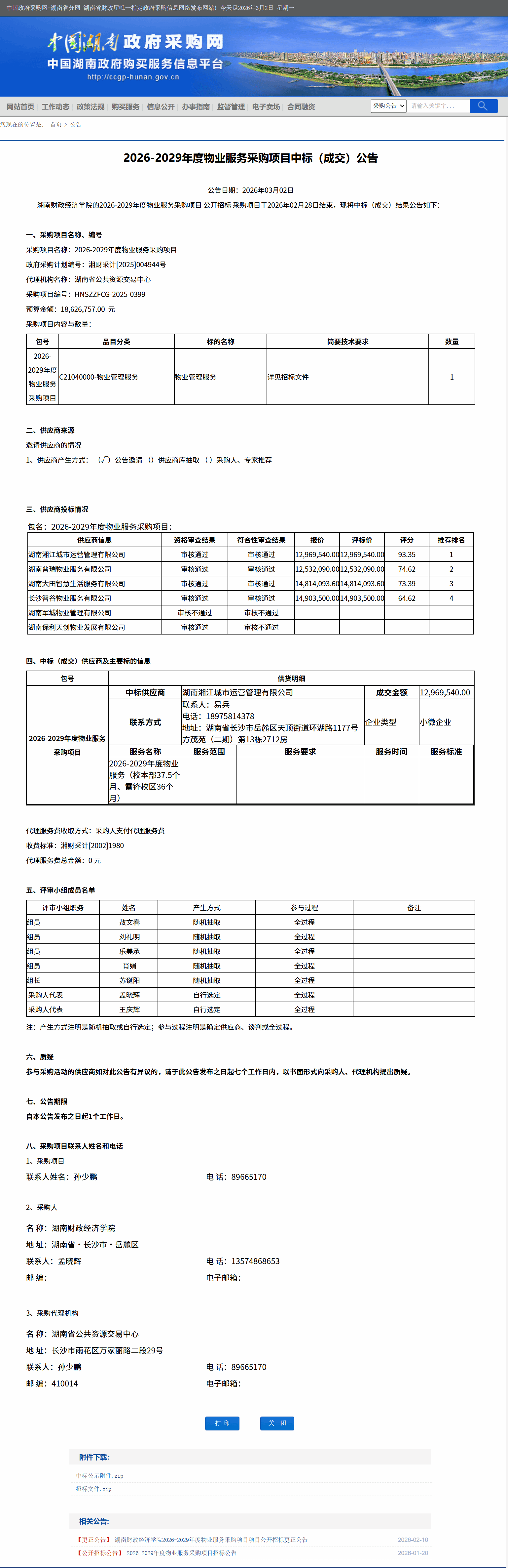 湖南省政府采购网:WilliamHill官方网站2026-2029年度物业服务采购项目中标(成交)公告