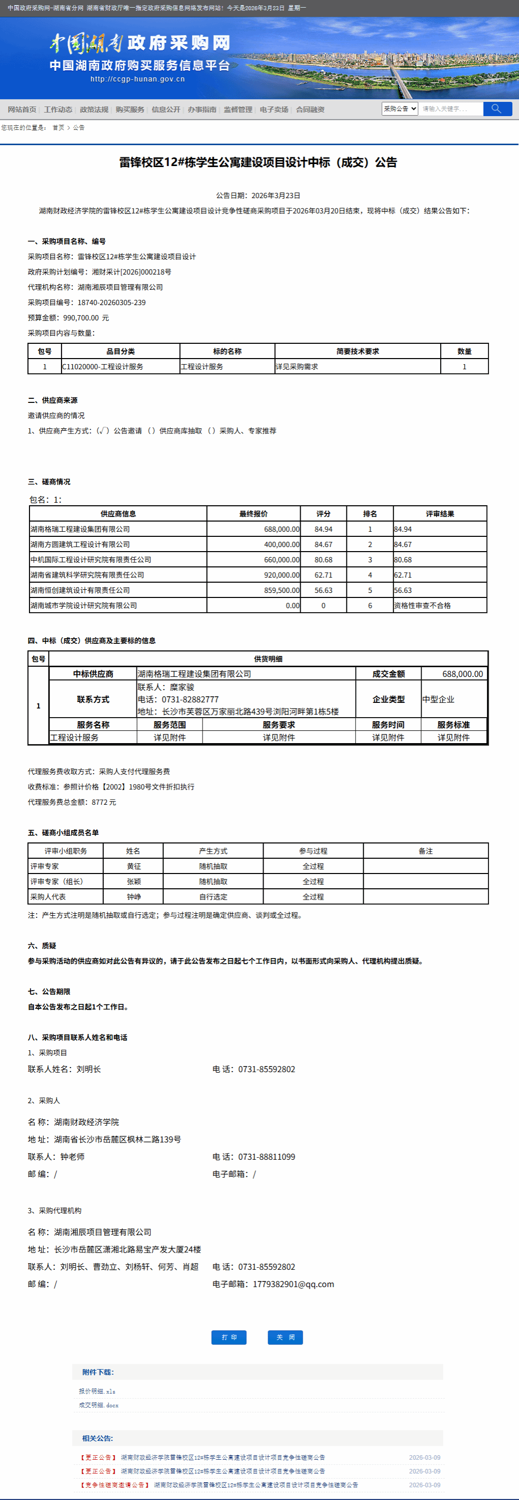 湖南省政府采购网:雷锋校区12#栋学生公寓建设项目设计中标(成交)公告