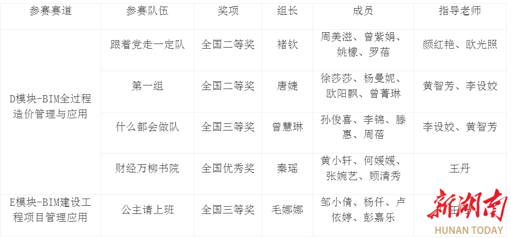 学校高度重视本次赛事,在工程管理学院的精细组织下,选派了由工程管理学院院长颜红艳牵头,专业教师欧光照、黄智芳、李设姣、王丹等指导的6支队伍参加了3个赛道的比赛。在师生的共同努力下,学校斩获佳绩,展现了学校学生的创新思维能力和专业实践动手能力。