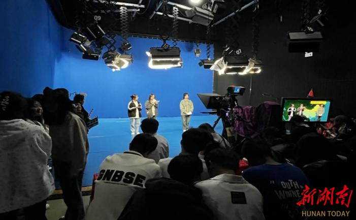 同学们在演播厅体验节目录制