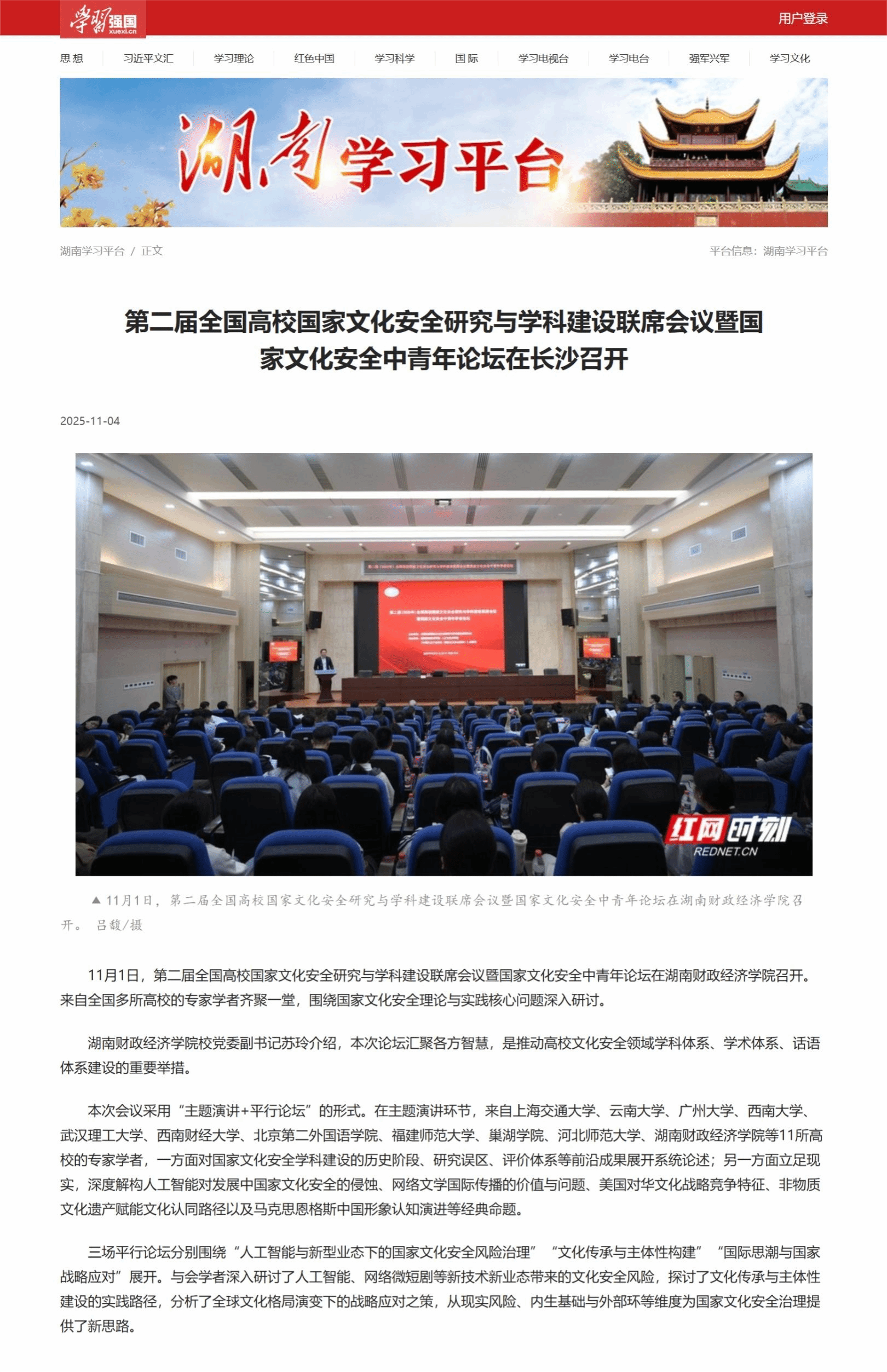 学习强国、新湖南、红网时刻、人民网:第二届全国高校国家文化安全研究与学科建设联席会议暨国家文化安全中青年论坛在长沙召开