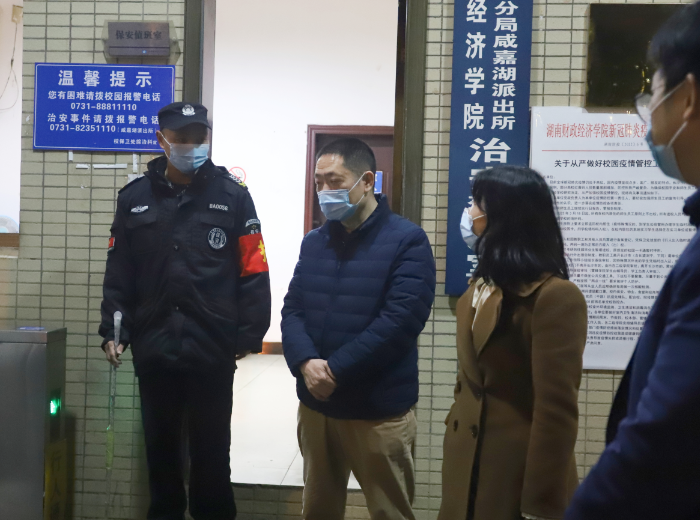 4月1日晚,WilliamHill官方网站党委书记肖湘愚、校长刘长庚分别带队视察主校区和雷锋校区疫情防控工作,强调牢固树立坚持就是胜利的信心决心,坚决克服麻痹思想、侥幸心理和松劲心态,落实巡查值班制度,打好特护期疫情防控保卫战,确保师生日常工作学习生活有力有序有效推进。当晚有关巡查值班人员陪同视察。