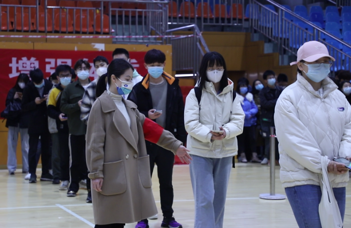 “请保持一米距离”,青年教师党员抗疫先锋队队员们佩戴党员徽章、红袖套在校本部体育馆主馆、架空层维护现场秩序。“请戴好口罩,出示身份证或健康码,检测完请往这边走”,一群身穿迷彩服、佩戴红袖套的退役复学学生志愿者劝说正在排队候检学生遵守防控要求,面对这种情况,大家都非常理解并配合防疫工作。
