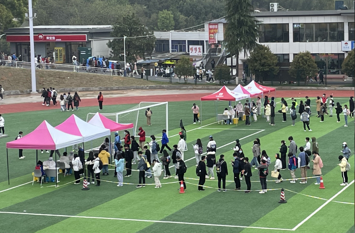 采集现场,师生员工每人佩戴口罩,前后隔开一米距离,主动出示健康码,有序等待检测。
