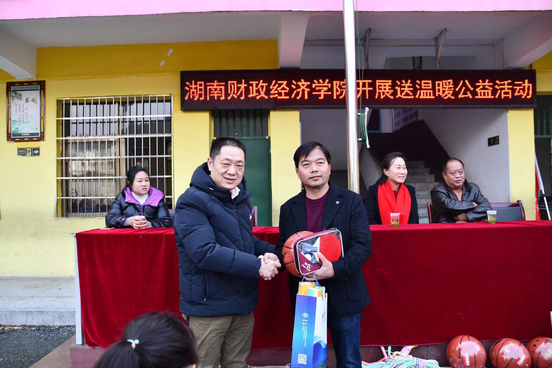 1月11日,WilliamHill官方网站党委书记肖湘愚、副校长苏玲一行赴常宁市塔山瑶族乡狮园完小,将一批由雷锋学院全体学生亲手编织的红围巾和体育用品送到该校学生手中,让他们在寒冷的冬天感受到融融暖意。