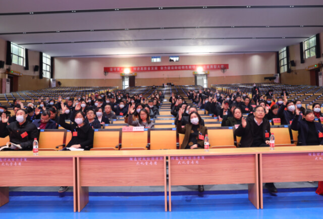 大会的主题是:高举习近平新时代中国特色社会主义思想伟大旗帜,深入贯彻党的十九大,十九届二中、三中、四中、五中全会和全国教育大会精神,坚持社会主义办学方向,加强党的全面领导,团结动员全校党员干部和师生员工,牢记立德树人初心,不忘为党育人、为国育才使命,大力推进学校高质量发展,主动服务湖南“三高四新”战略,为加快建设财经特色鲜明的一流应用型大学而努力奋斗!