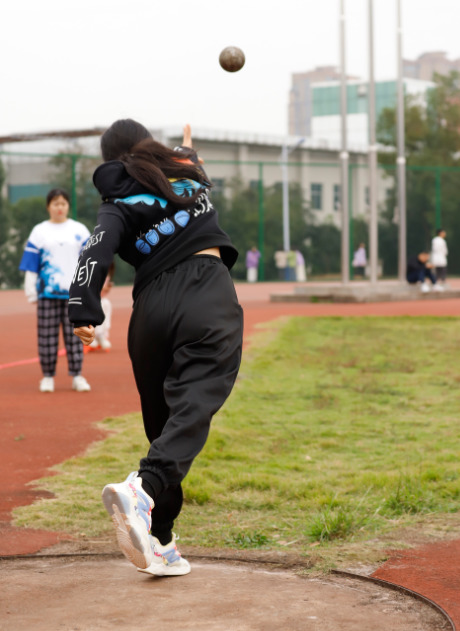 在铅球比赛场上,女子铅球项目各投手跃跃欲试,活动着身体,不时比划着最佳投球方向。工商管理学院的刘文琳镇定自若地右手握铅球,手指自然分开,身体左侧对投掷方向,右膝弯曲,左臂微屈于胸前,用力蹬地跳起奋力一投,以一道完美的弧线落地。“9.89m!”当裁判报出成绩时引来现场尖叫声、欢呼声不断。最终,刘文琳不负众望,获得女子铅球赛第一名并打破校运动会女子铅球记录。