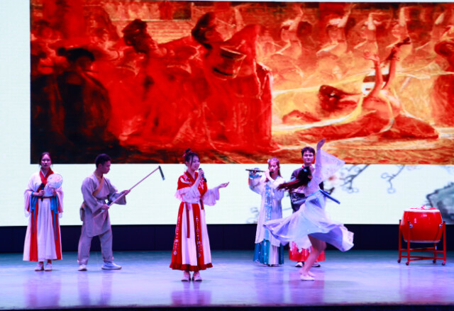 教师组黄碧琴朗诵《黄河颂》,气势磅礴,激情澎湃。彭立枝、孔征带来的《琵琶行》,古典抒情,融合唯美的舞蹈,为现场的观众带来了一场视听盛宴。