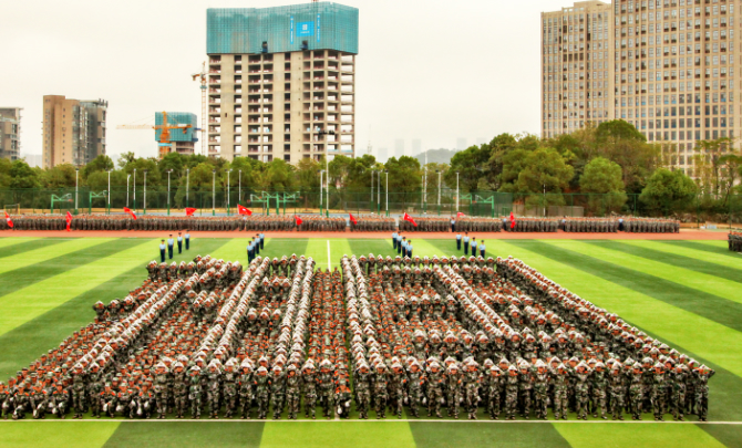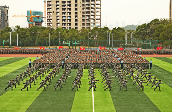 军事技能汇报演出中,捕俘拳方阵和捕俘刀方阵动作整齐划一,凌厉有力,虎虎生威,充分体现了同学们英勇顽强的战斗作风和刚毅豪迈的英雄气概。