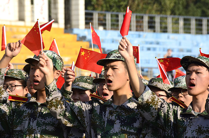 学生挥舞国旗唱响《我和我的祖国》 宋礼郡/摄