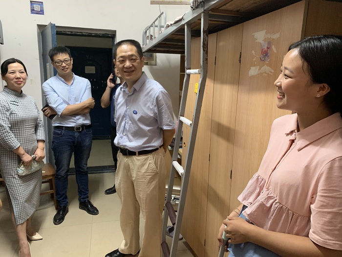 随后,肖湘愚一行深入学生宿舍2栋和9栋,详细询问同学们的日常学习和生活情况,了解学生对未来的职业目标定位,勉励同学们确定发展方向。同时,肖湘愚还叮嘱同学们,要学会克服困难,迎难而上,全面发展;要爱学习,多读书,让阅读成为生活,让读书涵养人生;要树立自信心,相信自己在经过大学的历练后会有更加精彩的人生。