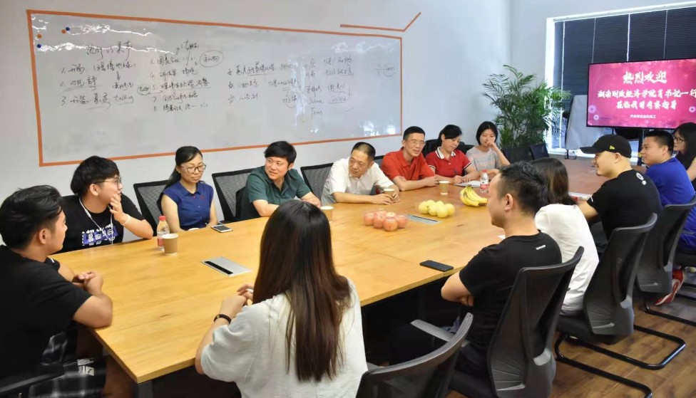 8月8日中午,肖湘愚一行来到吕晶同学的实习单位——湖南天合智造文化传媒有限公司。吕晶是人文与艺术学院2017网络与新媒体一班学生,家住邵阳县金称市镇秀峰村,爷爷奶奶年迈体弱,需要长期治病吃药,父母是普通职工,全家一年4万余元的收入要负担三个子女的学费,家庭经济负担很重。天合智造文化传媒有限公司对肖湘愚一行的来访十分重视,专门召开了座谈会,与学校领导、学生进行座谈交流,并对湖南财院学生在实习期间的表现给予充分认可,表示将进一步与学校在人才培养方面进行深度合作。会后,肖湘愚应邀参观了天合智造文化传媒有限公司,并看望了利用暑假时间在此实习的人文与艺术学院十余名学生。