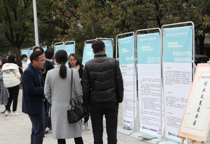 活动现场,30多个展板展示了学校创新创业政策体系、创业孵化基地、创业项目介绍、创业典型人物风采、创业创业大赛回顾等内容,杞颗树、大学生家教中心、夏忆服装有限公司、大学生家教中心、九洲学生服务工作室、智慧财务管家、女书密语、优享加等入驻创业园的10多个创业项目进行了现场实物展示,吸引了众多师生驻足观看或体验。