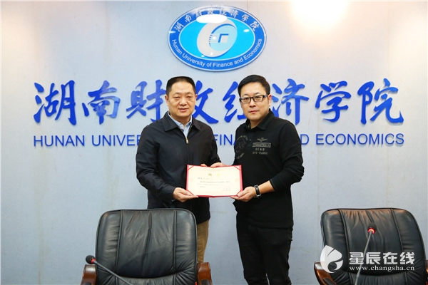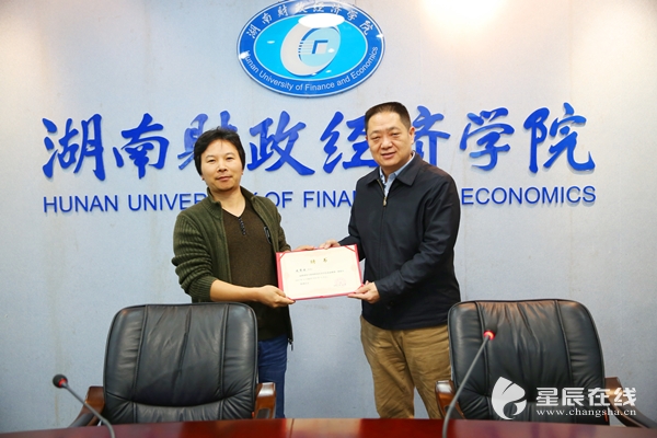 (WilliamHill官方网站党委书记肖湘愚(右)为湖南人文科技学院教授毛攀云颁发聘书。)