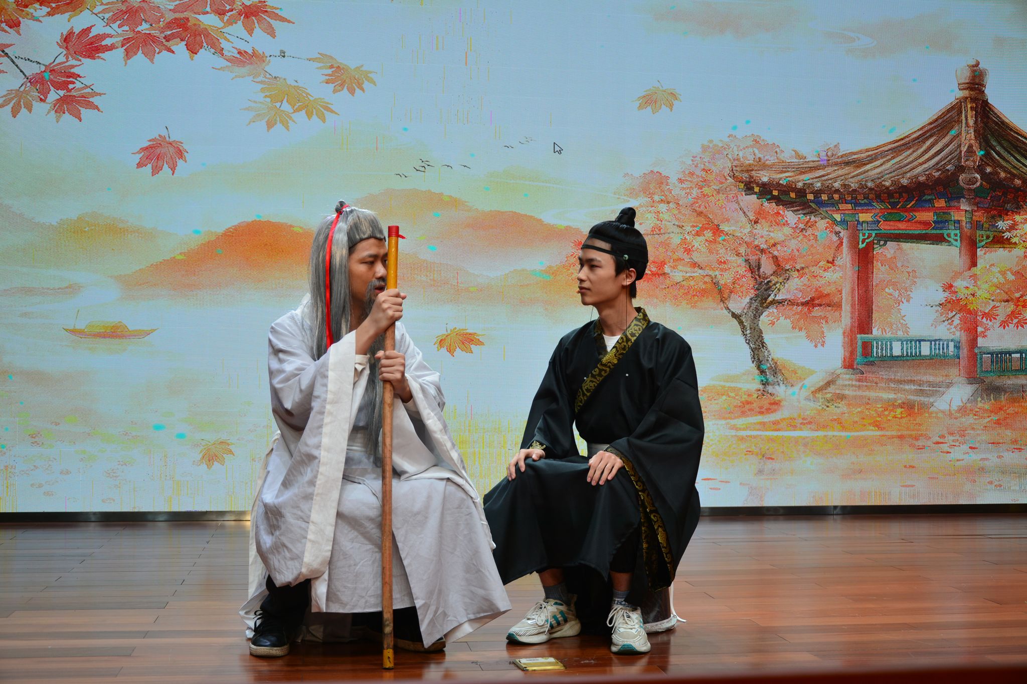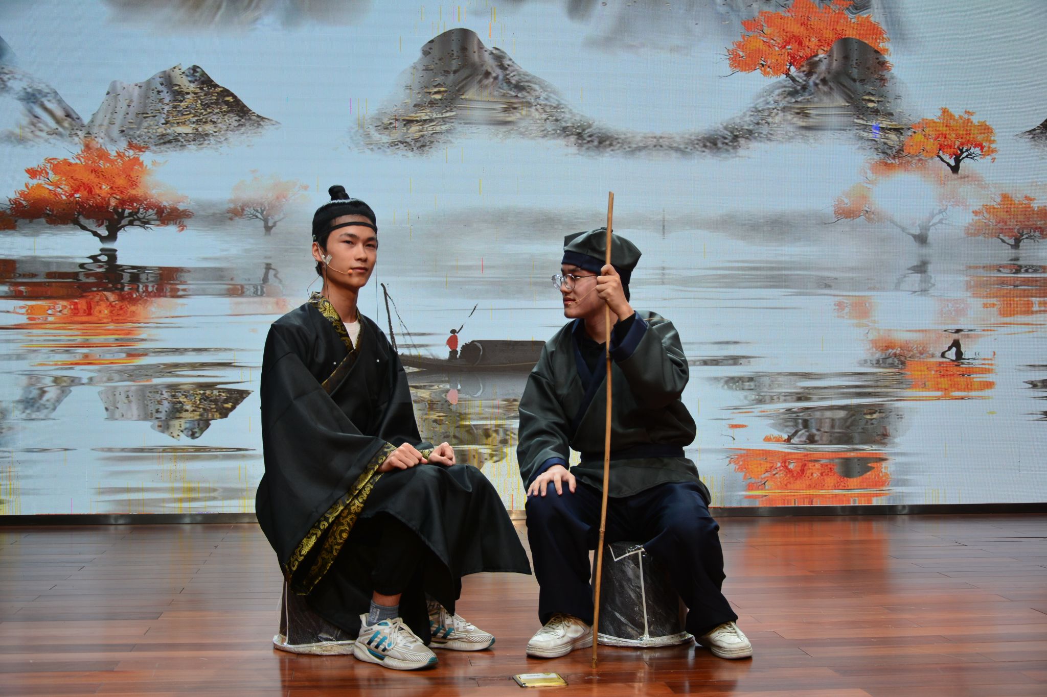 汉语言文学专业学生谭佳鑫、王林海、彭天赐分别扮演屈原,贾谊和船夫角色,以跨越时空的对话,为观众生动地呈现了一场别开生面的表演,博得了阵阵喝彩。