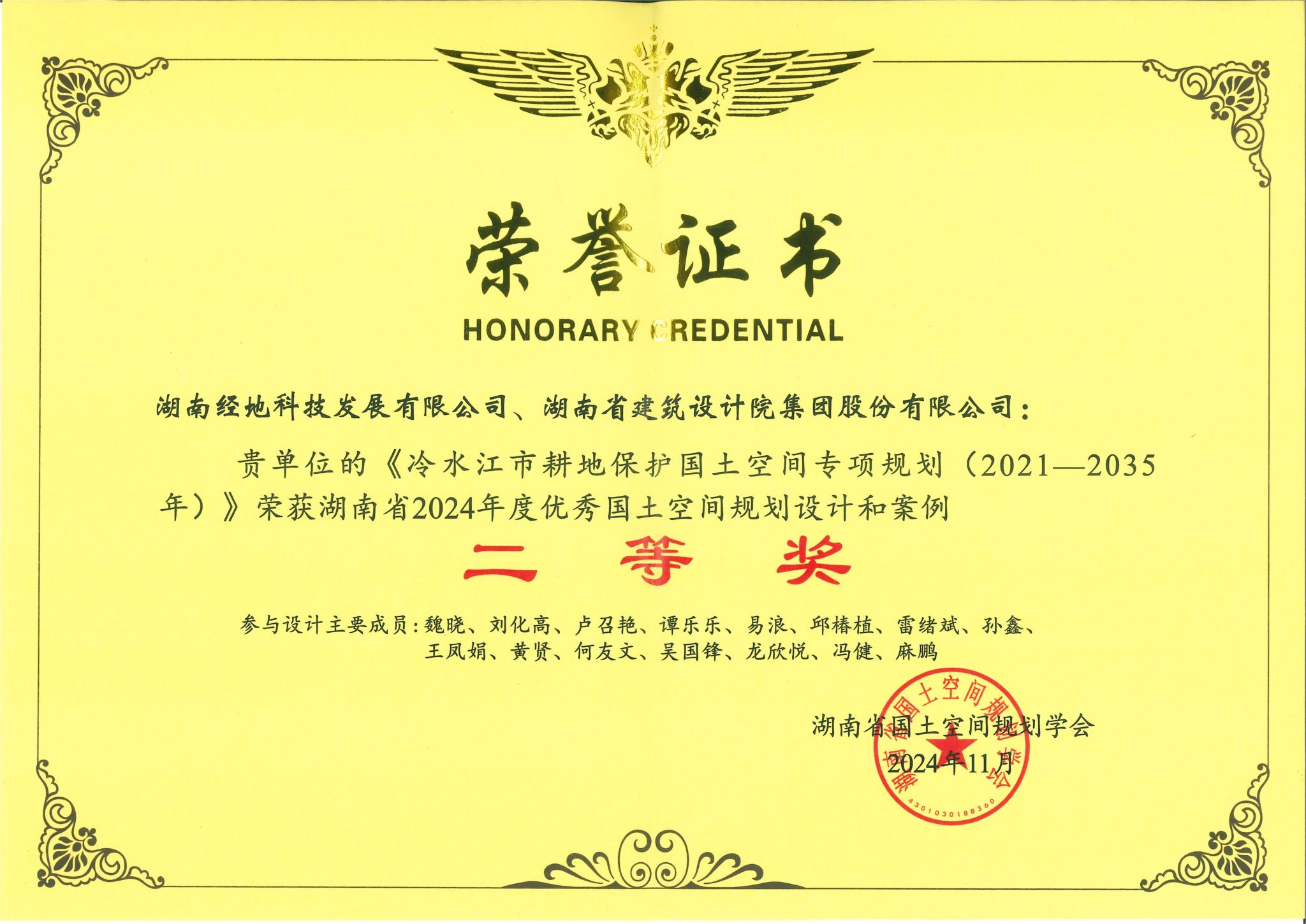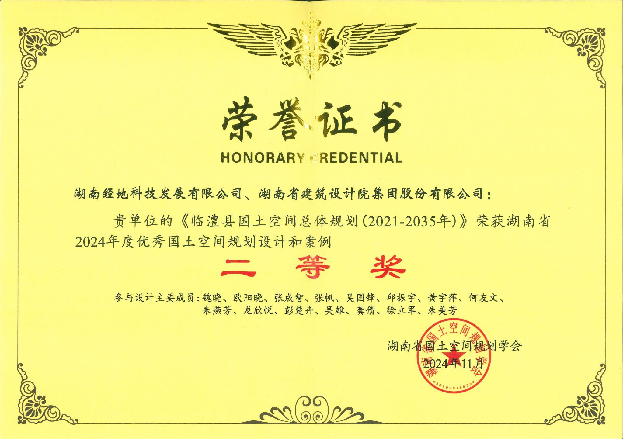 (本网讯)近日,由湖南省自然资源厅指导,湖南省国土空间规划学会主办,湖南省地质博物馆协办的“共绘美丽湖南,共享宜居环境——2024年优秀国土空间规划设计和案例展评活动”结果揭晓。经组织推荐、初审、网络投票、专家评审和评委会综合评议等环节,由公司技术团队牵头负责,湖南省建筑设计院集团股份有限公司共同编制的《临澧县国土空间总体规划(2021-2035年)》和《冷水江市耕地保护国土空间专项规划(2021-2035年)》两个项目荣获二等奖。