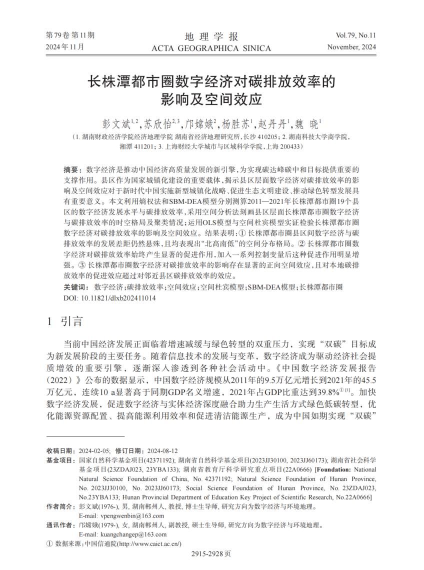 彭文斌,苏欣怡,邝嫦娥,杨胜苏,赵丹丹,魏晓. 长株潭都市圈数字经济对碳排放效率的影响及空间效应[J]. 地理学报, 2024, 79(11): 2915-2928. DOI: 10.11821/dlxb202411014.