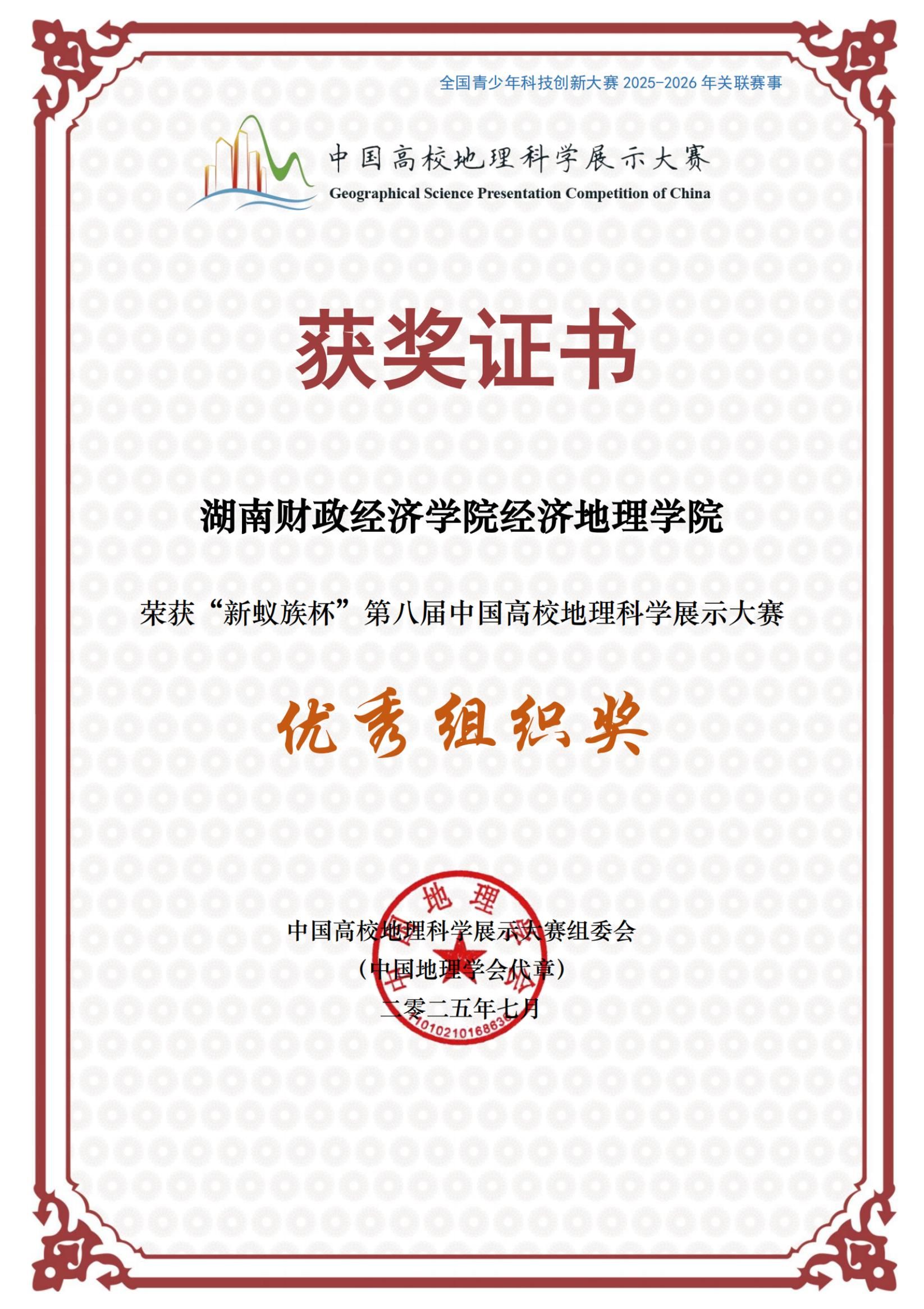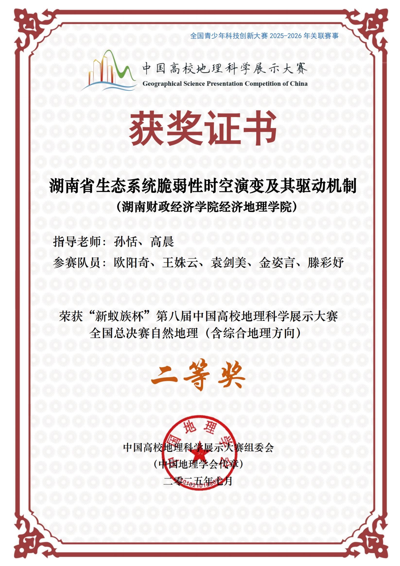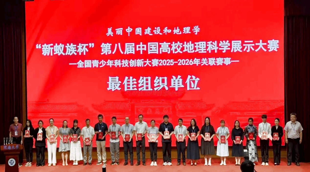 (本网讯)7月2628日,“新蚁族杯”第八届中国高校地理科学展示大赛全国总决赛在河南大学(开封)成功举办。经济地理学“地网奇点队”凭借出色的表现,经过多轮激烈角逐,最终斩获“自然地理(含综合地理方向)组二等奖”。同时,经济地理学院在组织工作中的卓越表现,获“最佳组织单位”光荣称号。