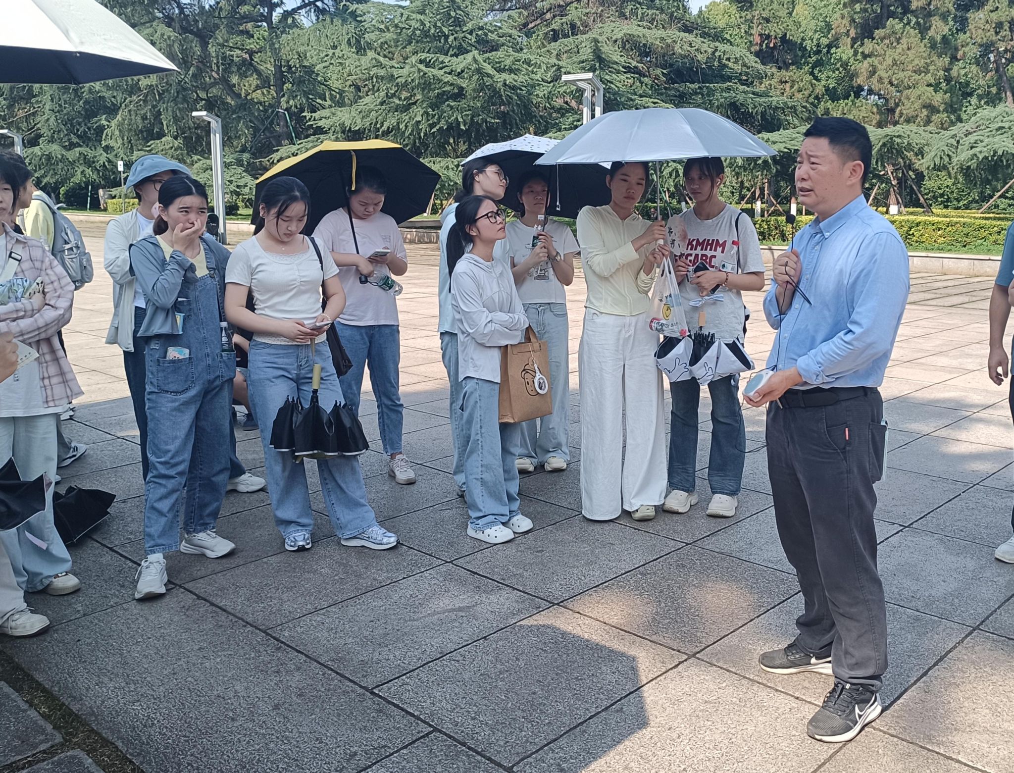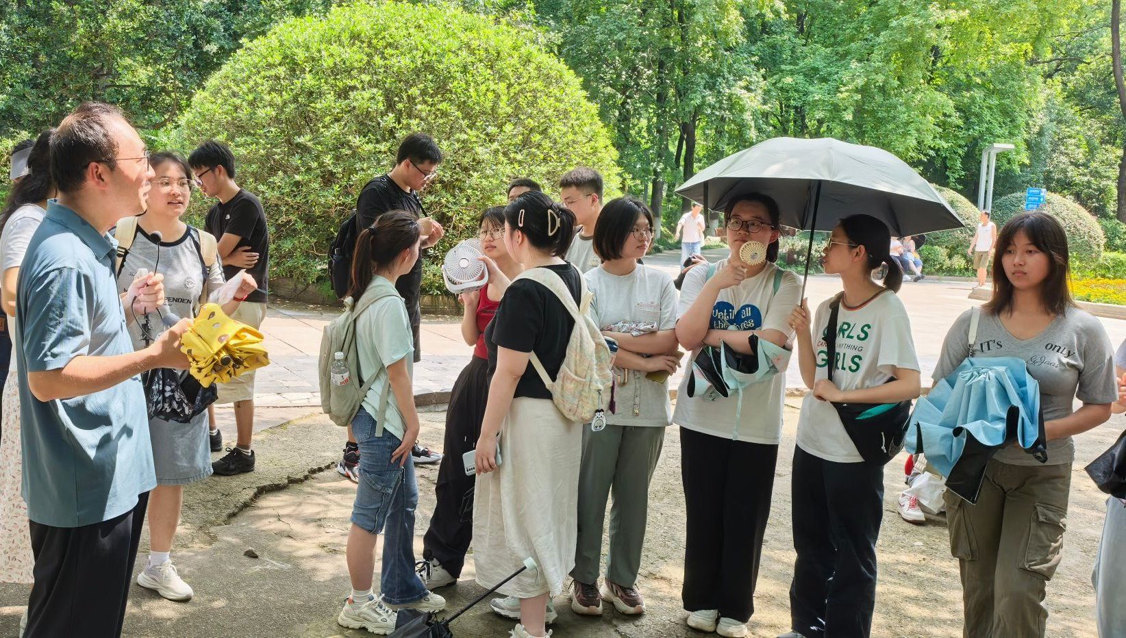 在自由参观环节,经济地理学院教师分别结合自己的专业领域,向同学们介绍分析参观过程中的专业思考。许骏老师从点线面规划角度,阐述如何通过合理的布局提升空间美学;廖炜老师聚焦景观设计,探讨功能分区的优化策略;汤洋老师分析公园对周边经济和房价的带动作用,阐释城市发展助力;马书琴老师着重讲解红色文化的传承与弘扬;余潇老师关注自然生态,分享水体植物保护的重要性。在老师们的讲解下,同学们对公园有了更深刻的理解,也对专业知识有了更直观的认识。
