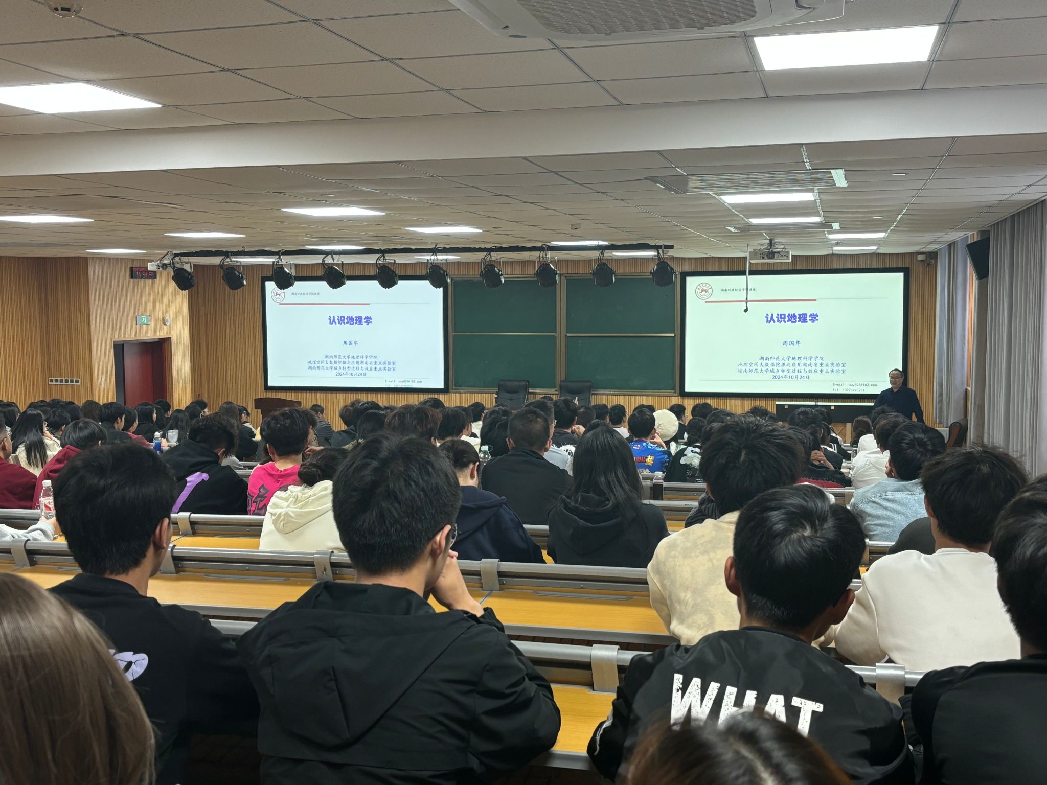本网讯10月30日下午,湖南师范大学地理科学学院院长周国华教授应经济地理学院邀请来校为24级新生作《认识地理》主题讲座。讲座由经济地理学院副院长苏昌贵主持,经济地理学院学科办、教务办、两系主任以及全体24级新生200余人聆听了讲座。