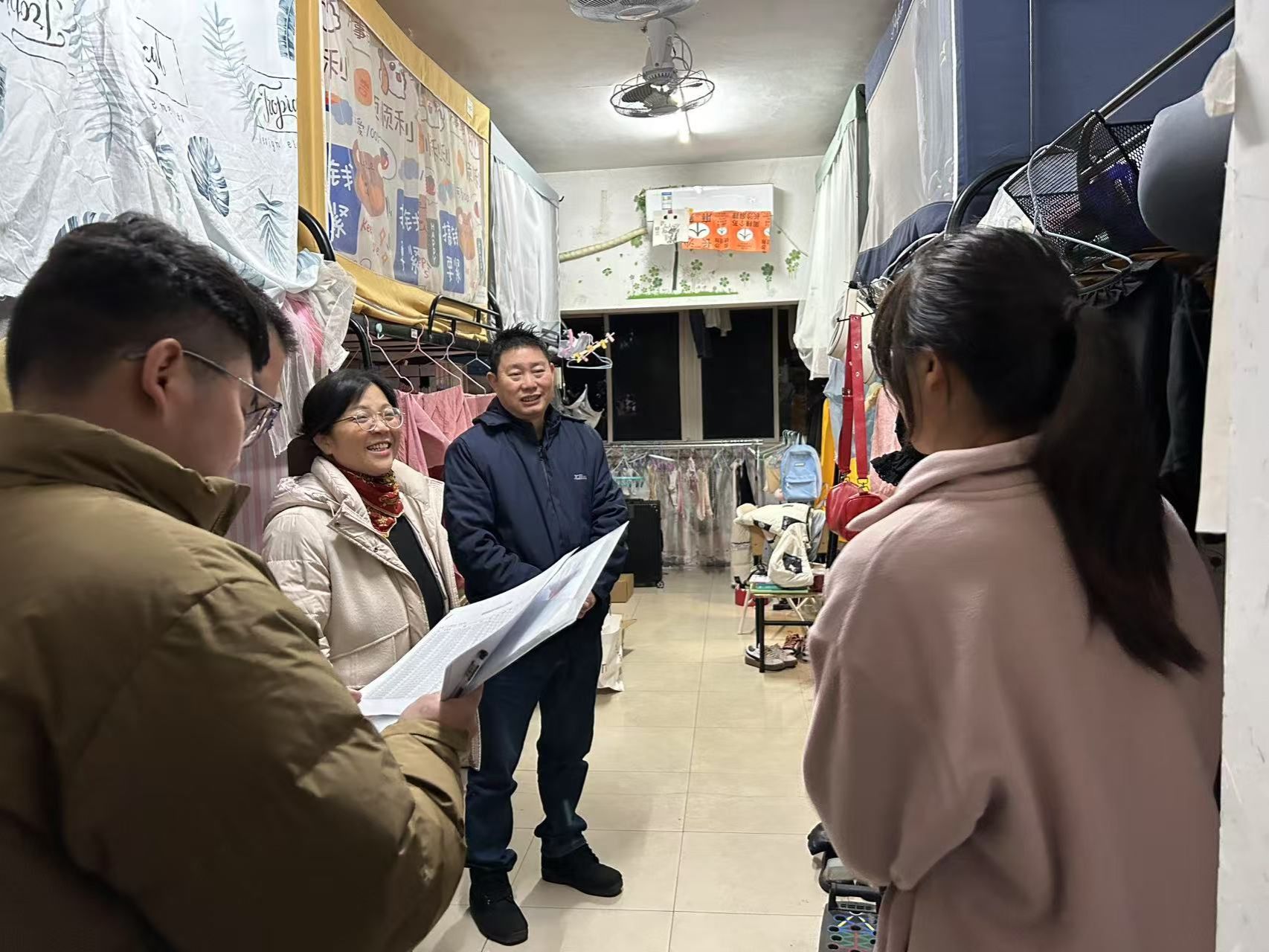 走访过程中,学院领导们每到一处都仔细询问学生的假期生活、返校后的适应情况以及新学期的学业规划。姚旭辉书记亲切地与学生交流,鼓励他们尽快适应新学期的学习节奏,保持良好的学习和生活习惯。她特别强调了宿舍卫生和用电安全的重要性,提醒同学们共同维护一个安全、整洁的宿舍环境。