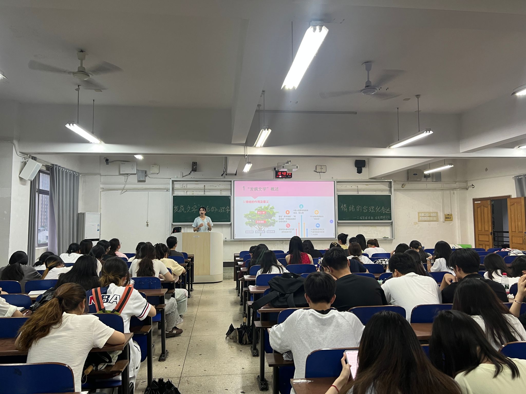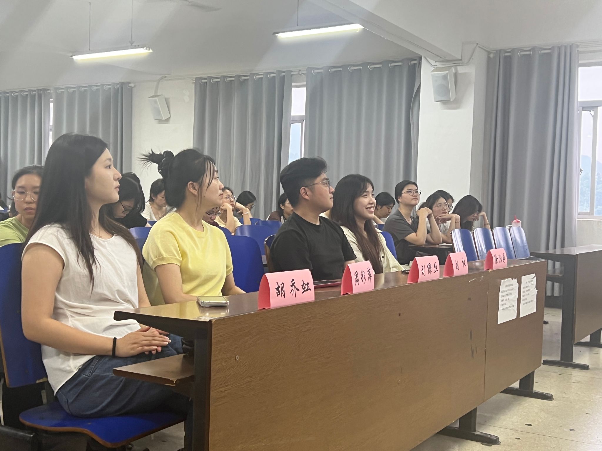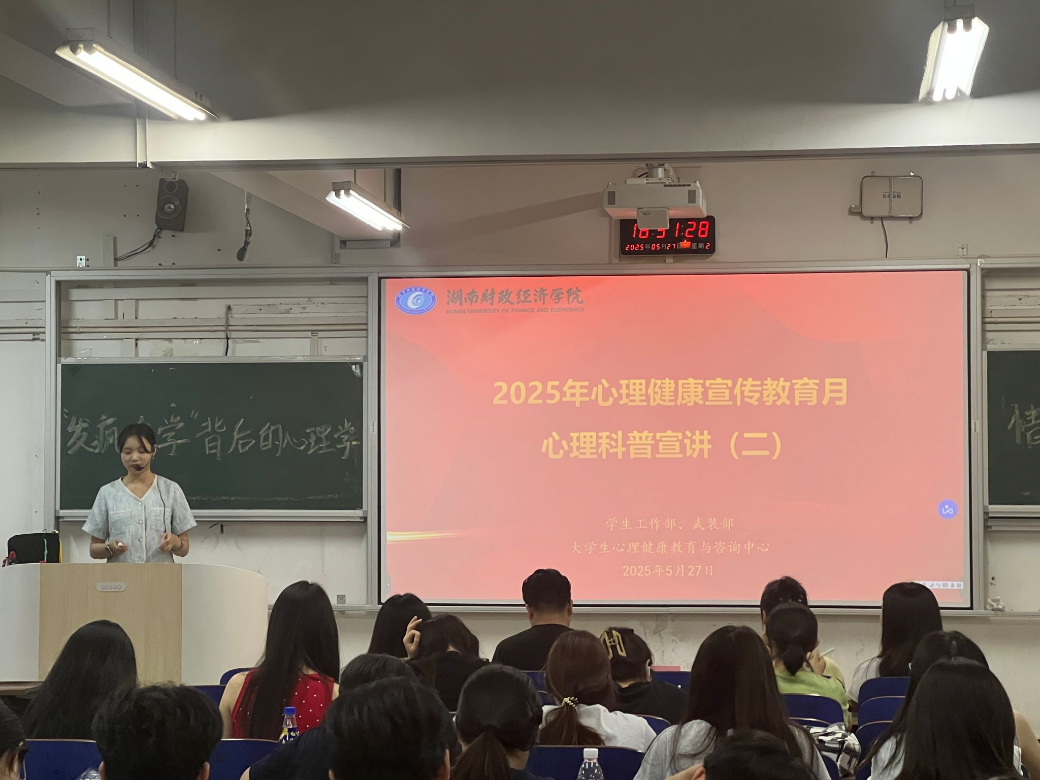 (本网讯)为助力寝室长和心理委员提升应对心理问题的能力,学会合理表达与宣泄情绪,5月27日晚,经济地理学院联合工程管理学院在主校区第三教学楼3207教室联合举办心理讲座,特邀校心理健康中心甘婷老师开展以“‘发疯文学’背后的心理学:情绪的合理化表达”为主题心理健康科普宣讲活动。校心理健康中心周彩萍、胡乔虹,工程管理学院徐湘婷和经济地理学院刘权四位老师,学院全体寝室长和各班心理委员参与活动。