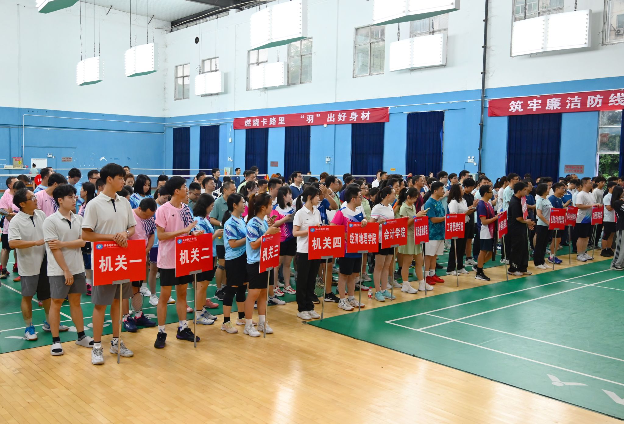 (本网讯)5月7日至12日,由校工会、纪委联合主办的2025年“啄木鸟杯”教职工羽毛球团体赛在主校区体育馆举行。校党委书记易棉阳,党委副书记苏玲,副校长赵鹤平,纪委书记李雪山,副校长、校工会主席刘钟理出席开幕式。来自18个分工会的300余名教职工以球会友,在挥拍扣杀间传递活力,在知识竞答中弘扬廉洁风尚。