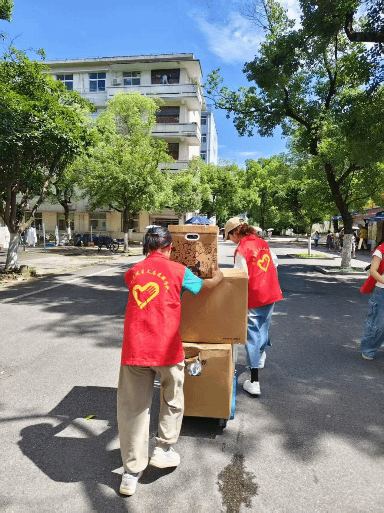 在搬迁过程中,产生了不少温暖瞬间。女生宿舍区,志愿者主动为行李较多的同学分批运送物品;面对高楼层搬运,志愿者自发组成"传送带"队伍,接力搬运重物;志愿者将闲置收纳盒赠予学弟学妹,践行环保理念。