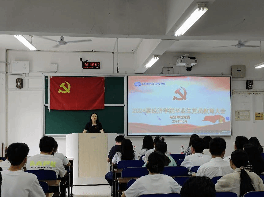 (本网讯)为激励全体毕业生党员坚定信念,牢记党员责任,以良好的精神风貌踏入新的征程,以实际行动和优异的成绩为党旗增辉。6月14日,经济学院在主校区3313教室召开毕业生党员教育大会。学院党委书记余华、党委副书记刘英、学生第一党支部书记谢龙、第二党支部书记李伦及全体毕业生党员参加会议。会议由谢龙主持。