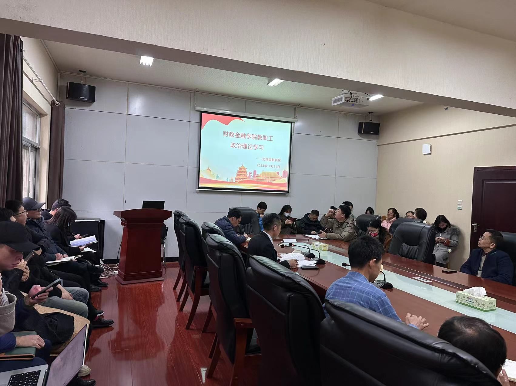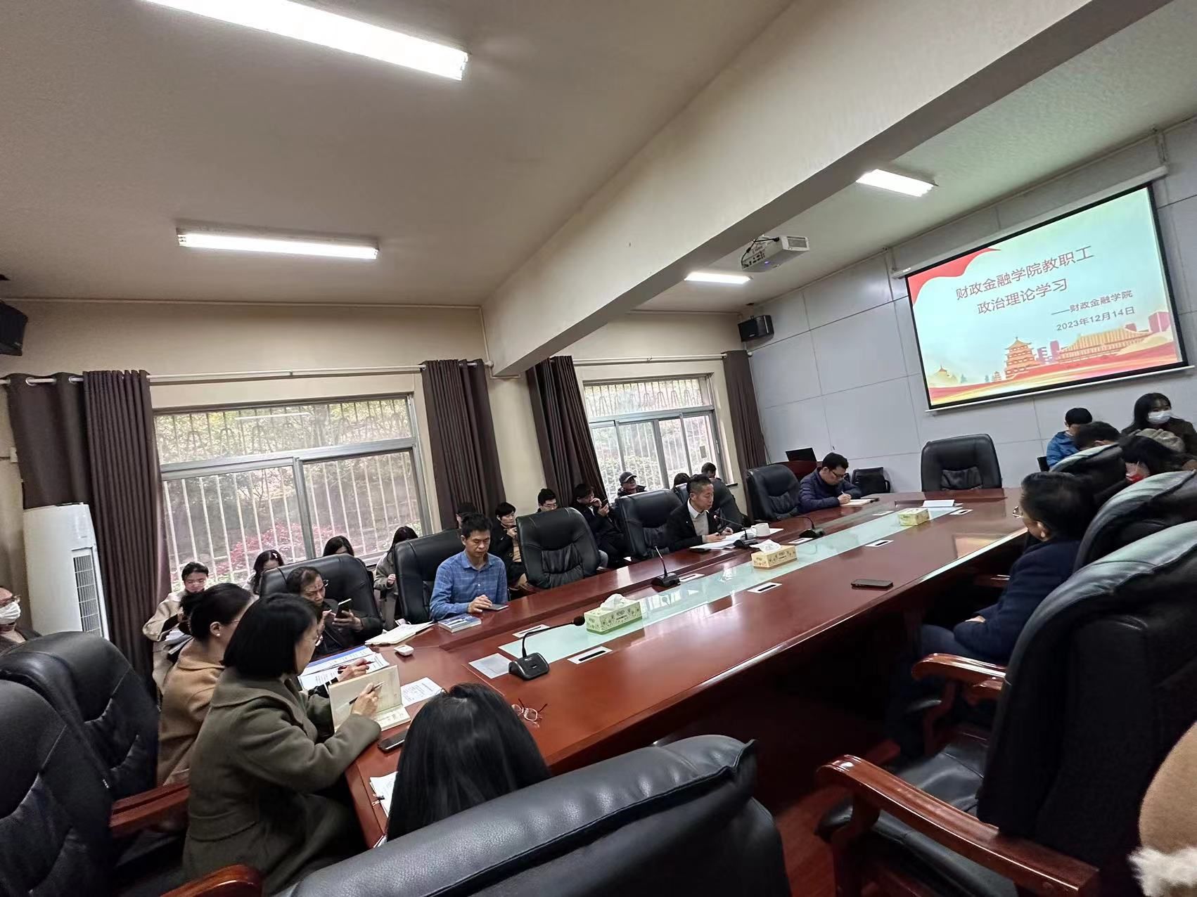 2023年12月14日,财政金融学院在办公楼119会议室召开全体教职工大会,开展政治理论学习,学院党委书记 肖燕飞主持会议,全体教职工参加会议。