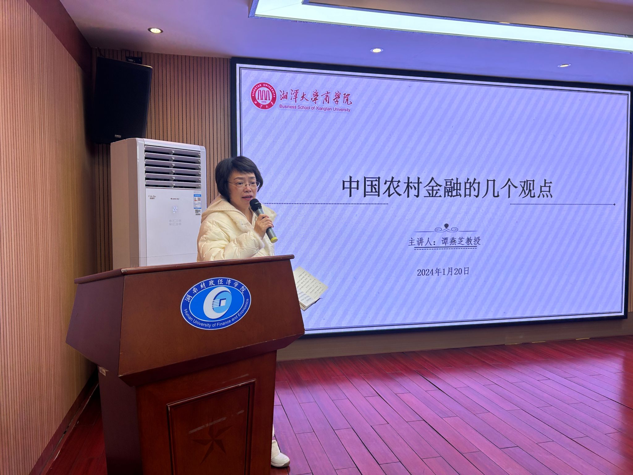 湘潭大学商学院谭燕芝教授以《中国农村金融的发展现状》为题,阐述中国农民收入与美国农民收入差距较大,涓滴效应未发挥作用,农民缺乏抵押物造成金融抑制,需遵循农村经济发展一般规律和要素禀赋,财政扶贫不具可持续性,需要构建“输血”成“造血”的转变机制。