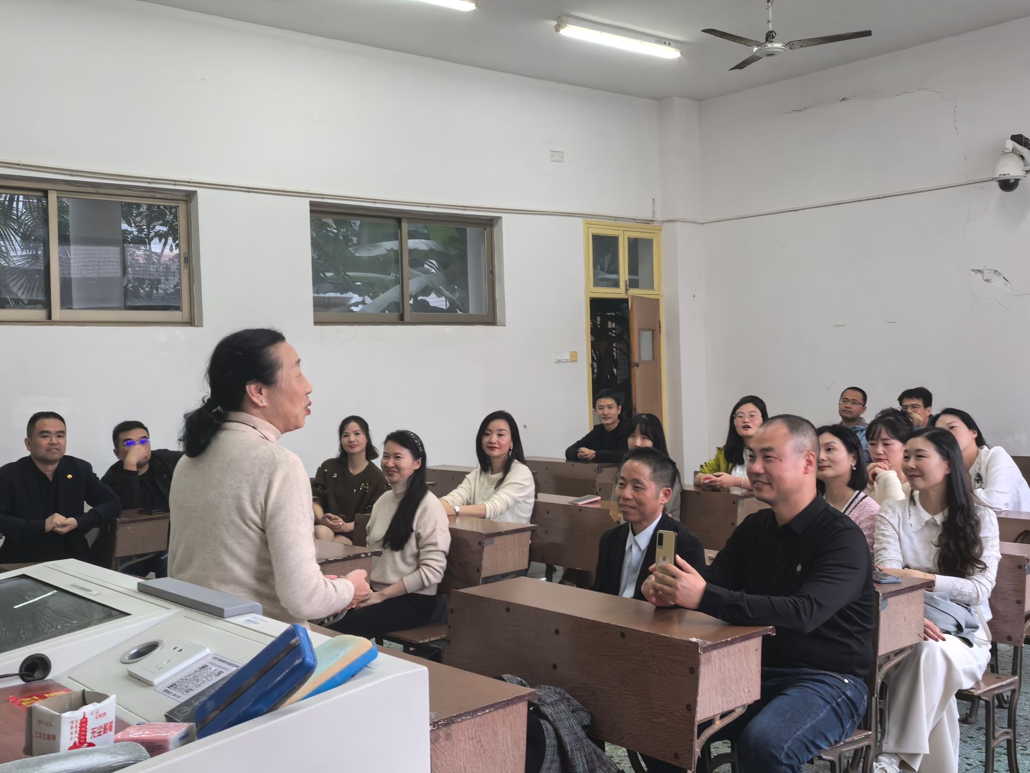 时隔二十载,校友们重回母校,感慨良多。在校门前、108级台阶上、而教学楼前纷纷留下合影。在二教学楼,曾经上课的教室,校友们开展了20年聚会座谈会。座谈会上,校友们分享各自当初在校的故事。周星明老师分享自己感言,对于学生取得的成绩表示肯定,希冀学生们以后越来越好。肖燕飞表示,校友与母校的情谊是割舍不断的情谊,学校的发展离不开校友们的支持,欢迎校友们常回校聚会,同学弟学妹分享学习经验,工作经验。也祝校友们生活幸福,事业有成。